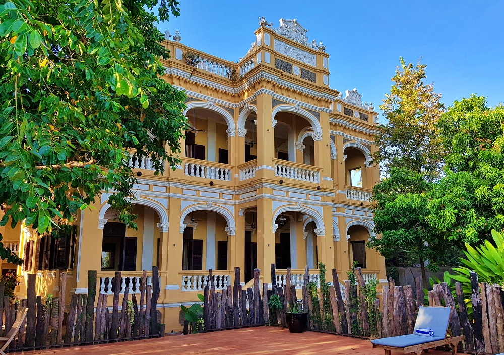The architecture alone is worth the journey. At the heart of it stands Le Relais de Chhlong, a mansion dating from 1916 that now operates as a hotel, its bones still graceful after all these years. Around it, neighboring buildings wear their age openly, each one a little different from the last.
